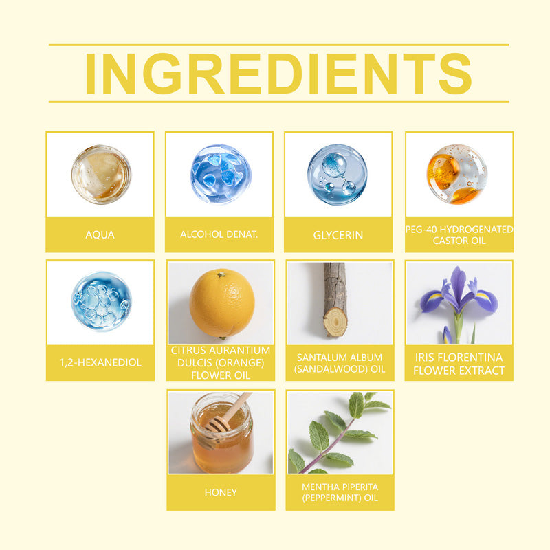 Ingrédients : Aqua, Alcohol Denat, Glycerin, Peg-40 Hydrogenated, 1.2-Hexanediol, Miel, etc.