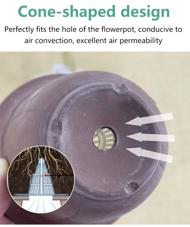 VENTILATION & ANTI-POURRITURE - Placé au fond de la jardinière, ce dispositif adopte une conception conique creuse en trois dimensions. Cela permet d'augmenter la perméabilité à l'air et le drainage, évitant ainsi l'accumulation d'eau. Il facilite la ventilation des racines et favorise leur croissance optimale.