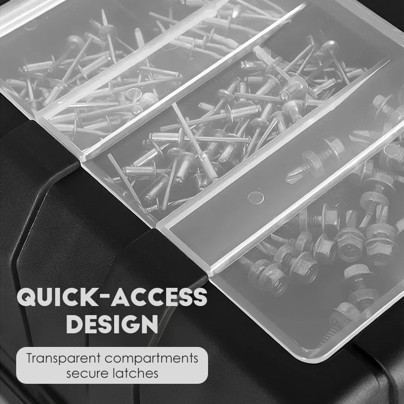 POIGNÉE ERGONOMIQUE & SYSTÈME DE VERROUILLAGE SÉCURISÉ : La poignée confortable réduit la fatigue lors du transport, tandis que les loquets en acier inoxydable maintiennent chaque niveau bien verrouillé. Les compartiments transparents permettent d’identifier rapidement le contenu et de gagner du temps lors de recherches.