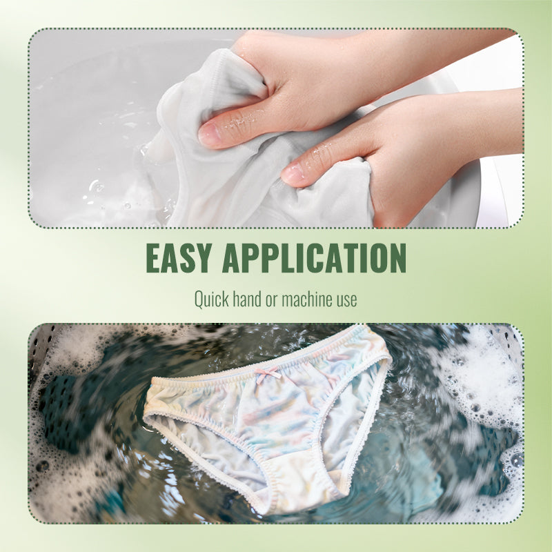 ÉLIMINATION DES TACHES – Cible le jaunissement et les taches de sang, redonnant aux sous-vêtements leur éclat d’origine tout en préservant la qualité du tissu.